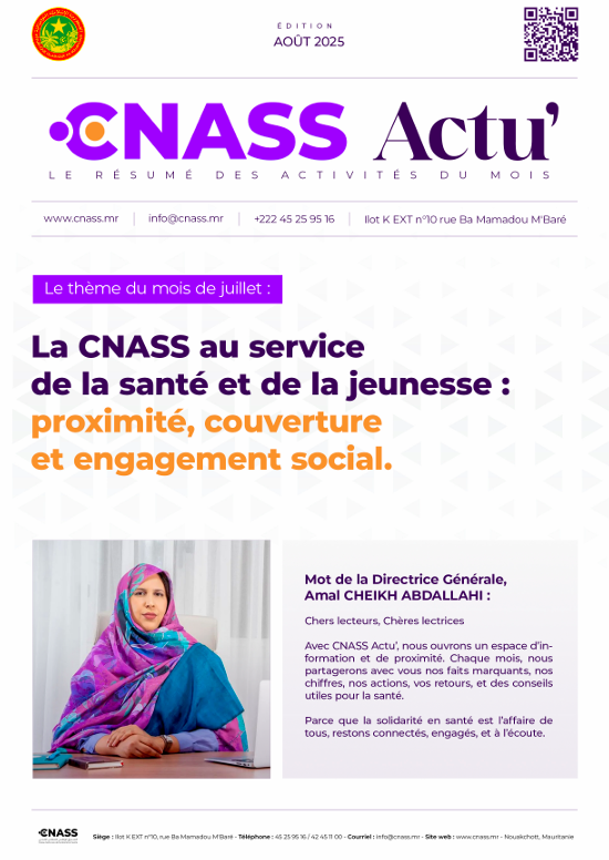 Il m’a été fait l’insigne honneur d’être nommée à la tête de la CNASS, avec pour mandat d’œuvrer à permettre à chaque Mauritanien et à chaque Mauritanienne de Se faire assurer et d’assurer sa famille contre le risque maladie, moyennant une faible participation financière. Je suis fière, à ce titre, de piloter une équipe d’experts aussi compétents que passionnés, sur lesquels je fonde beaucoup d’espoir pour la réussite de cette exaltante mission.